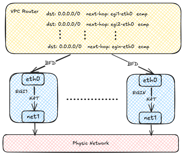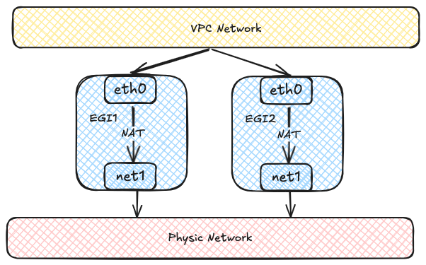 Each Egress Gateway consists of multiple Pods with multiple network interfaces. Each Pod has two network interfaces: one joins the virtual network for communication within the VPC, and the other connects to the underlying physical network via Macvlan for external network communication. Virtual network traffic ultimately accesses the external network through NAT within the Egress Gateway instances.