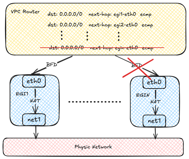 OVN uses the BFD protocol to probe multiple Egress Gateway instances. When an Egress Gateway instance fails, OVN marks the corresponding route as unavailable, enabling rapid failure detection and recovery.
