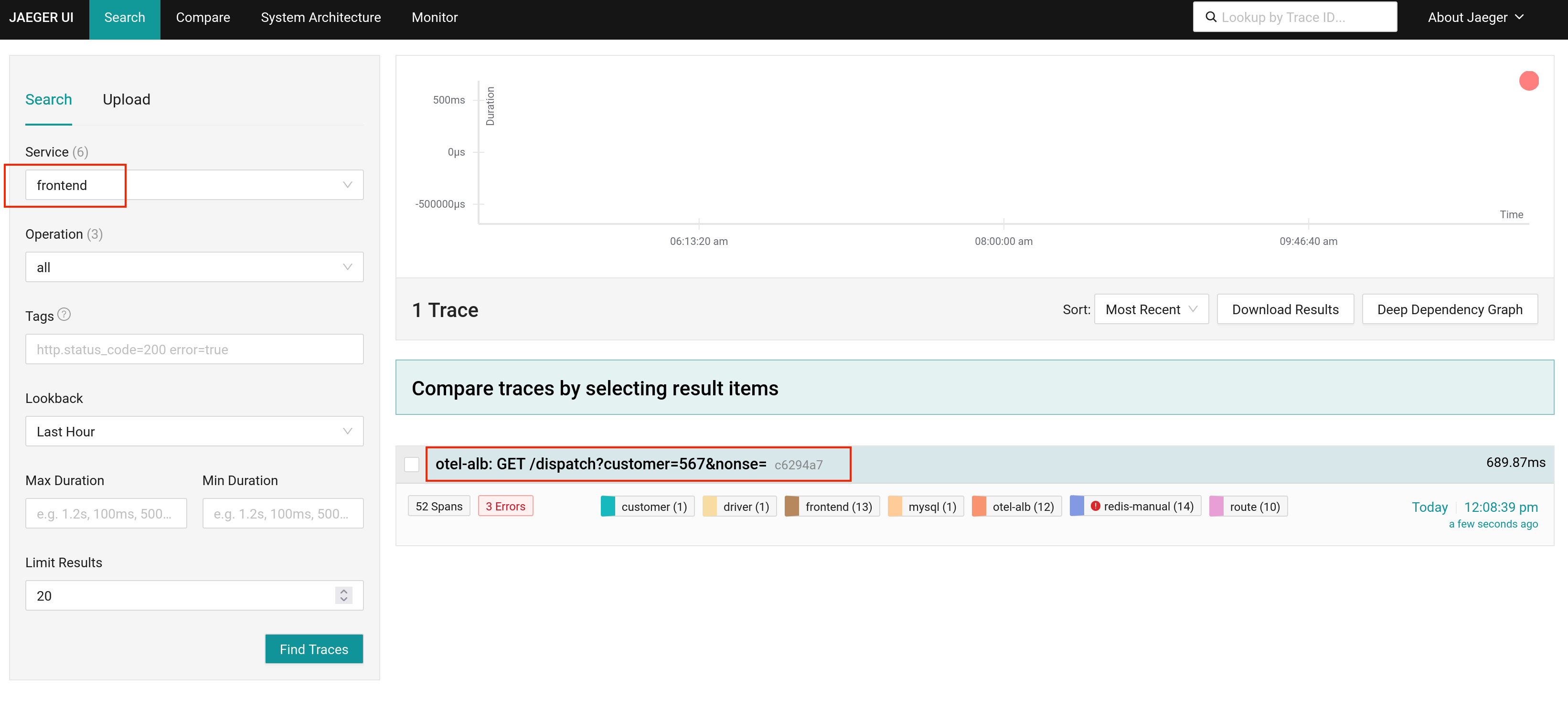 Open the access address of Jaeger obtained in Step 3 to view the results.